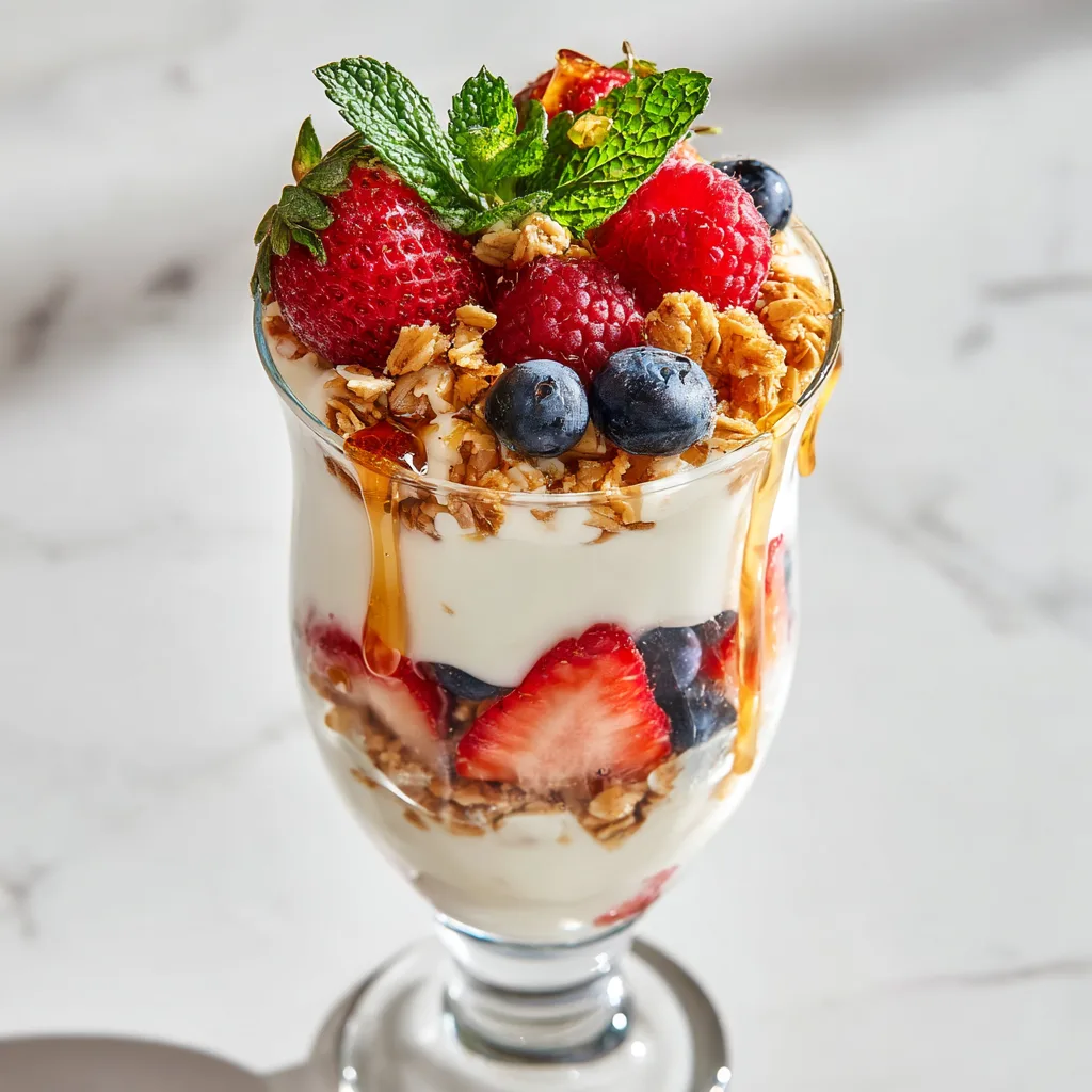 A refreshing layered breakfast made with creamy yogurt, crunchy granola, and fresh berries.