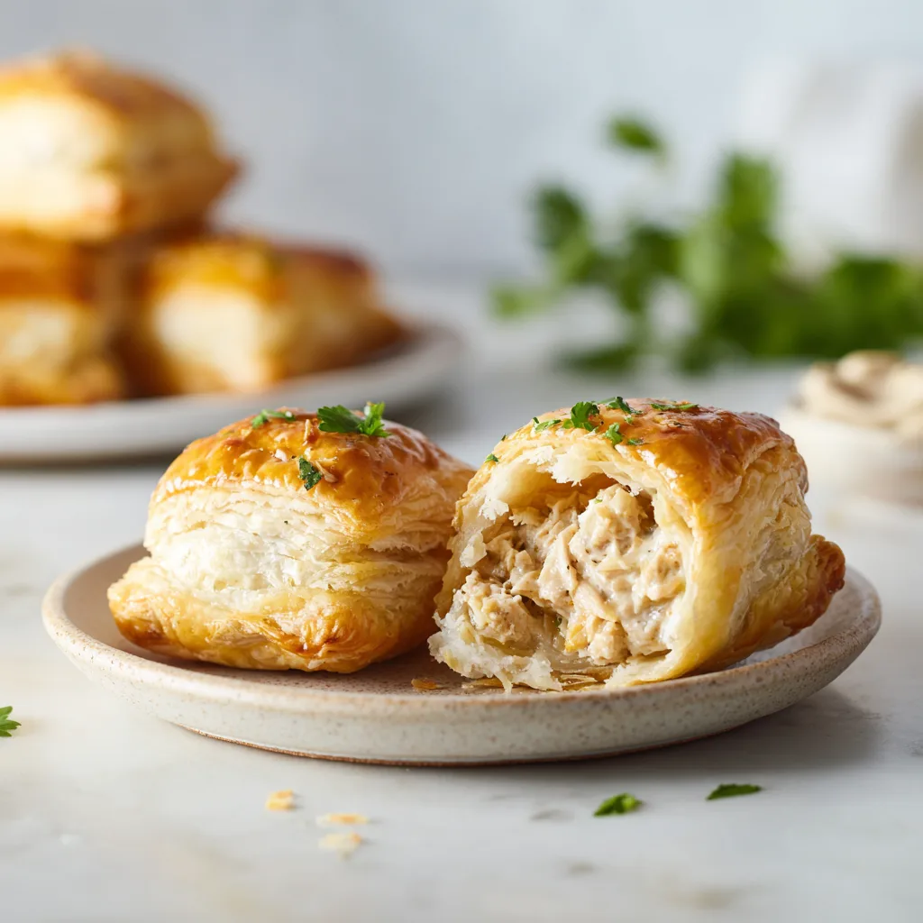 Flaky golden puff pastry filled with creamy, savory chicken—perfect for parties and appetizers.