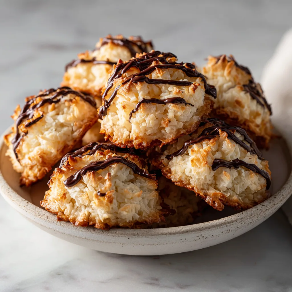Coconut macaroons are small, mound-shaped cookies made primarily from shredded coconut, egg whites, and sugar. Their texture is what sets them apart: crisp and lightly toasted on the outside, yet moist and chewy on the inside.