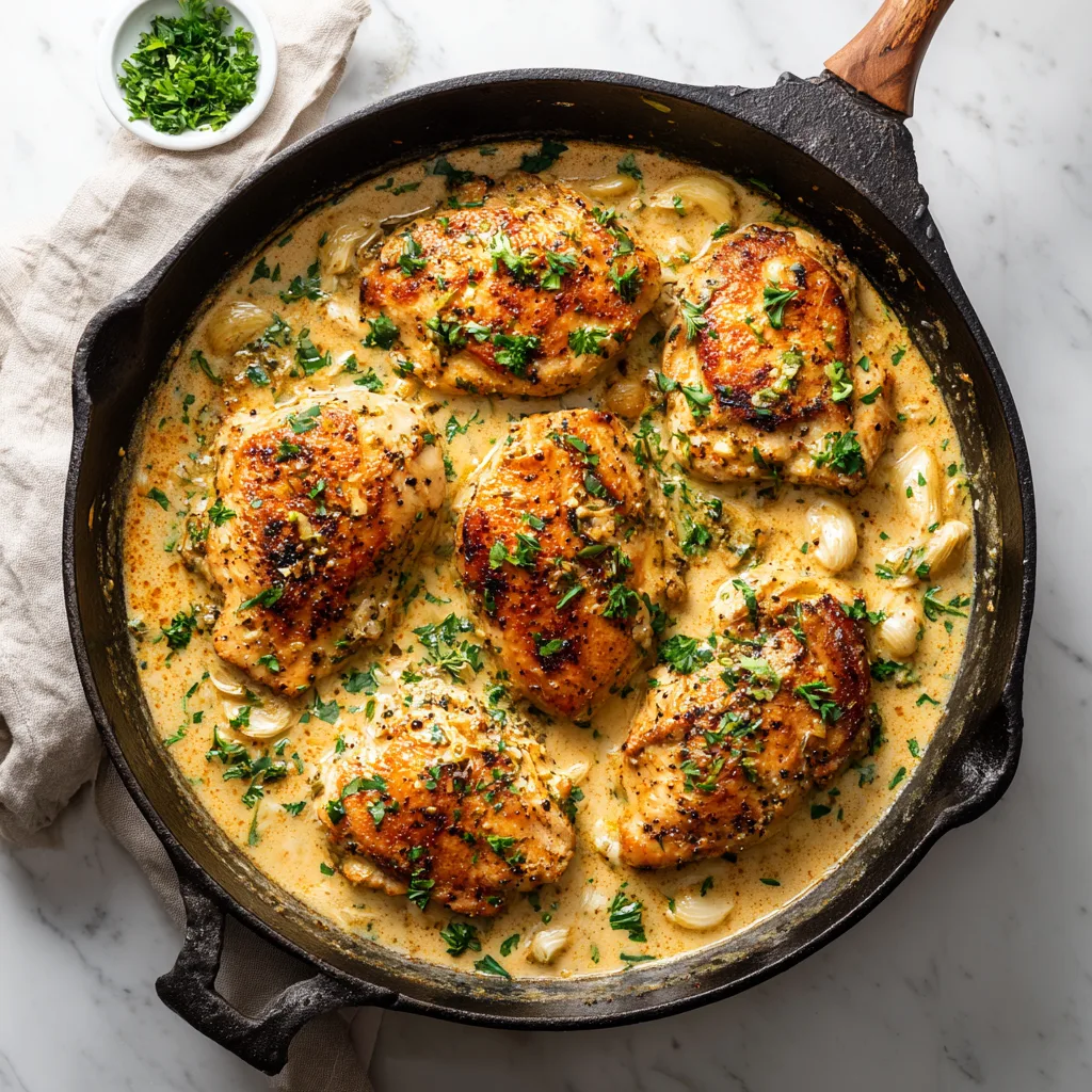 Place the chicken back into the skillet, spooning sauce over each piece. Simmer for another 8–10 minutes until the chicken is fully cooked and tender. - Garnish and Serve