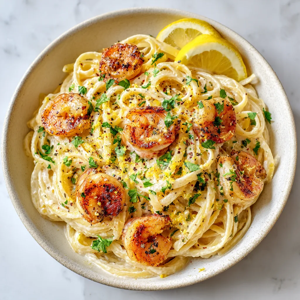 - Prepare sauce with butter, garlic, cream, lemon, and parmesan, then combine with pasta and shrimp.
