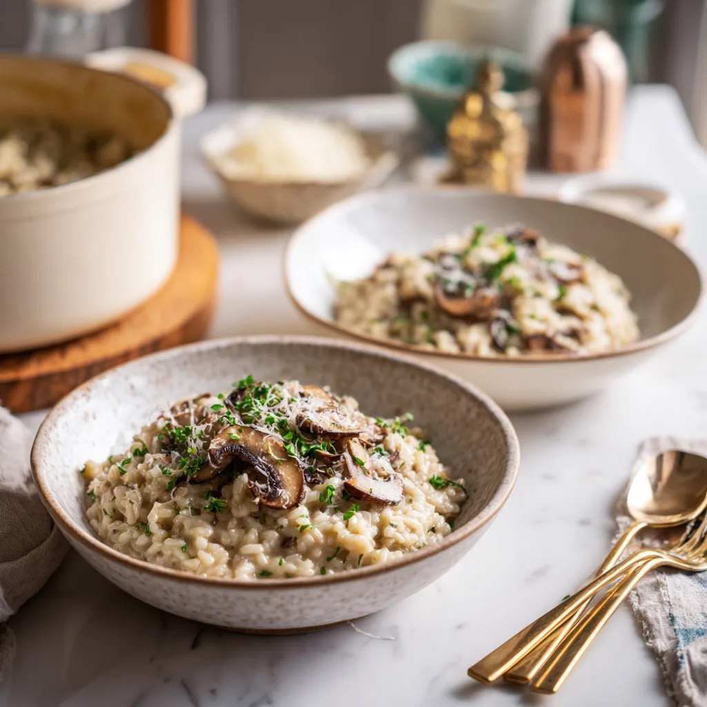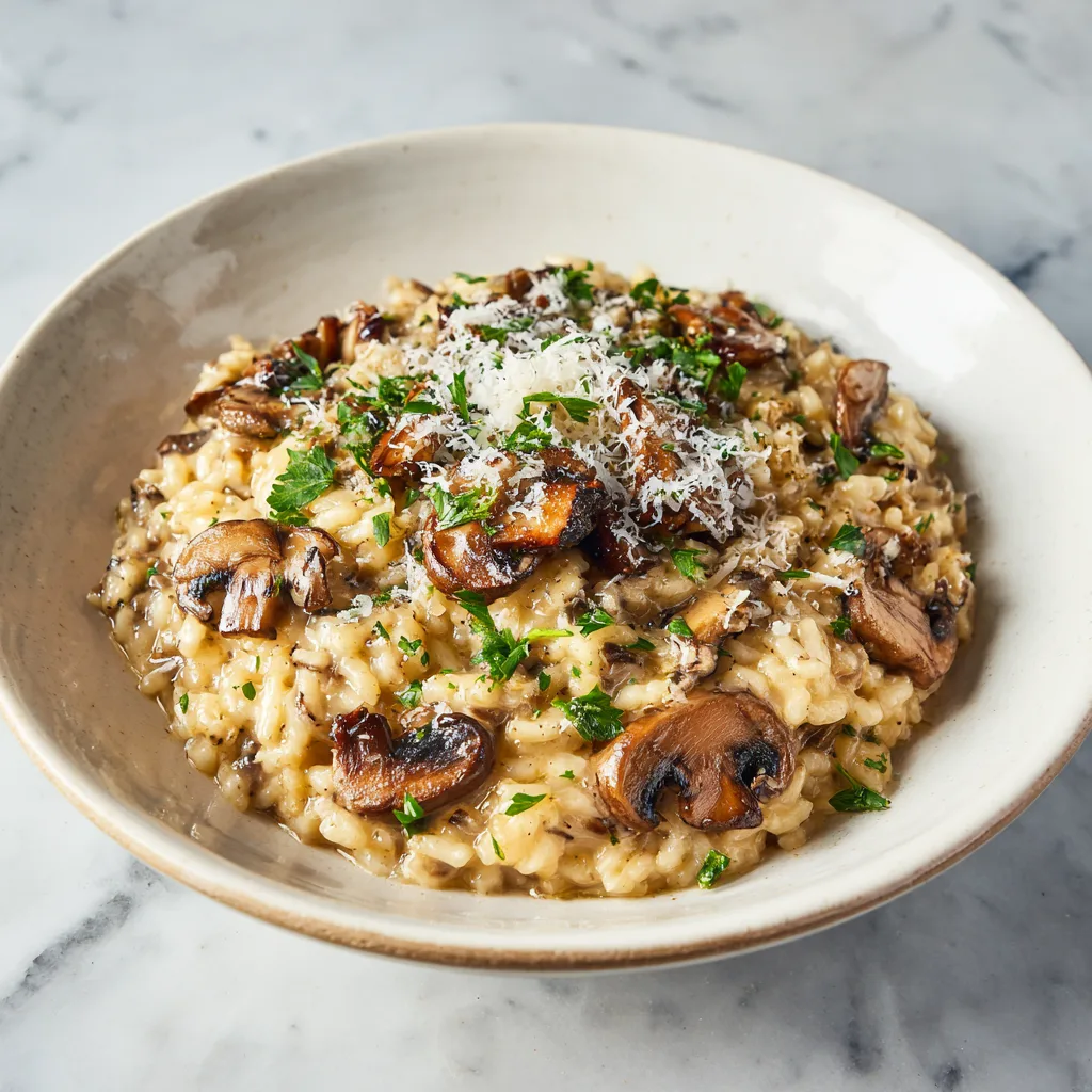 A rich and velvety Italian rice dish made with arborio rice, sautéed mushrooms, Parmesan cheese, and herbs for an elegant comfort meal.