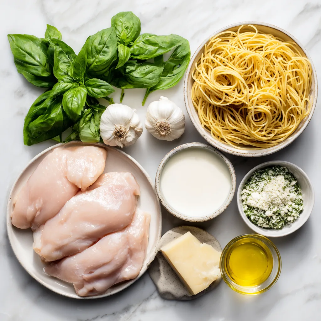 A rich and flavorful pasta dish combining tender chicken with a creamy basil pesto sauce.