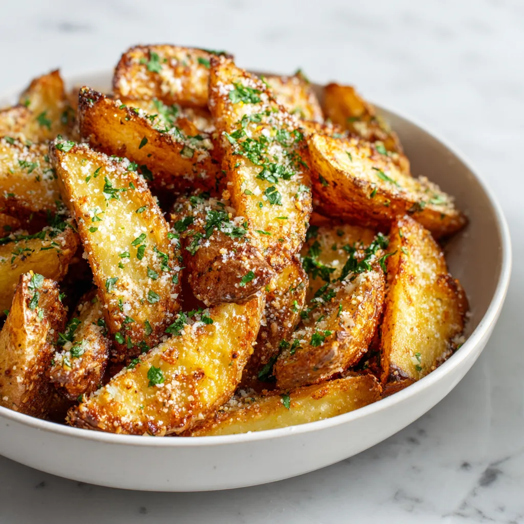 Golden oven-roasted potato wedges coated in garlic, herbs, and parmesan for the ultimate crispy snack.