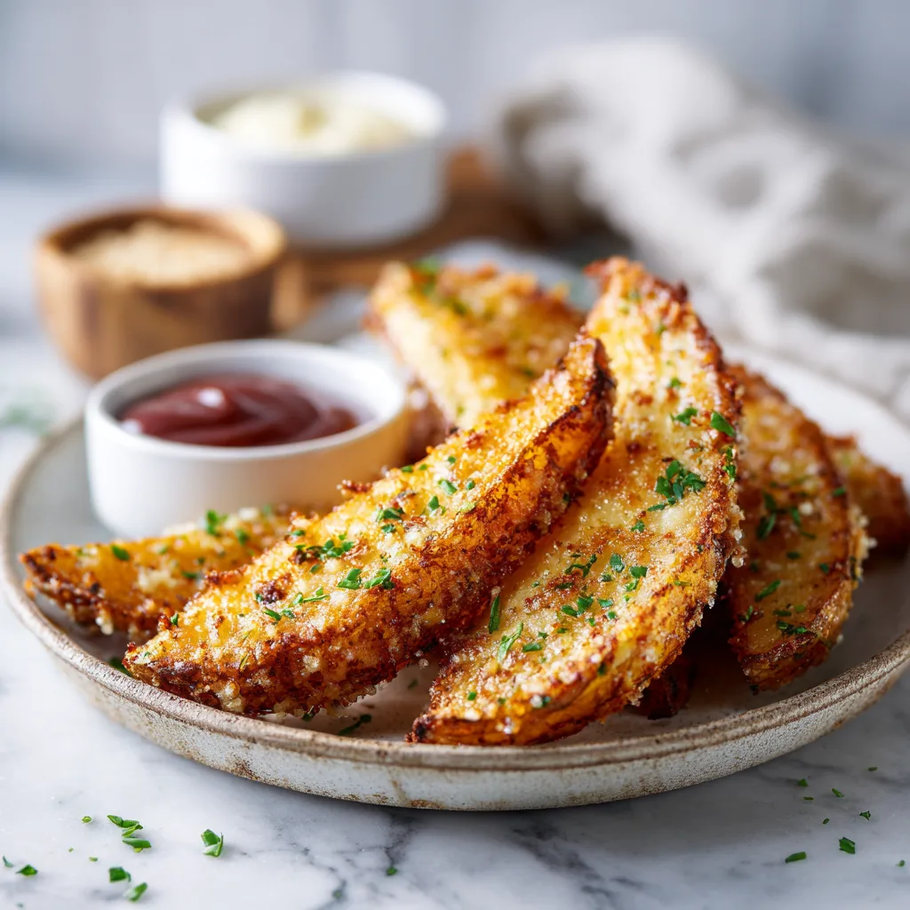 Potato wedges are believed to have originated as a rustic alternative to French fries. Their thicker cut allows for a perfect balance of crispy exterior and soft interior. Today, they’re enjoyed worldwide in countless variations—from classic salted wedges to bold, seasoned versions like this garlic parmesan favorite.