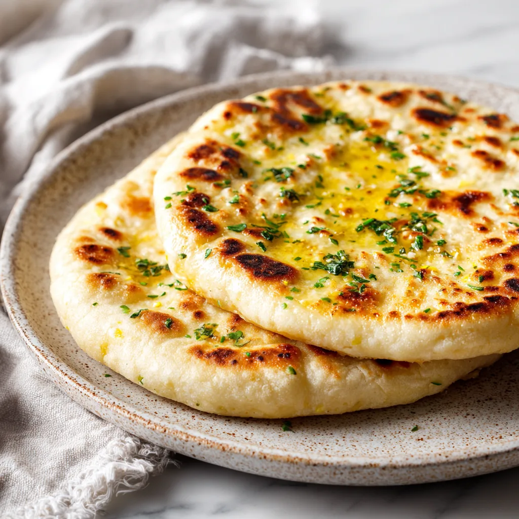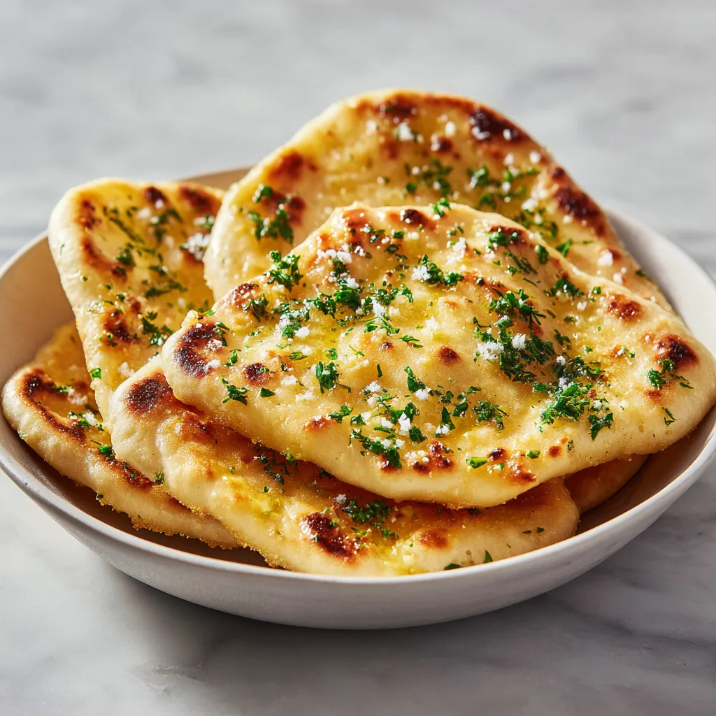- Rest dough, divide, roll, cook in skillet, then brush with garlic butter.