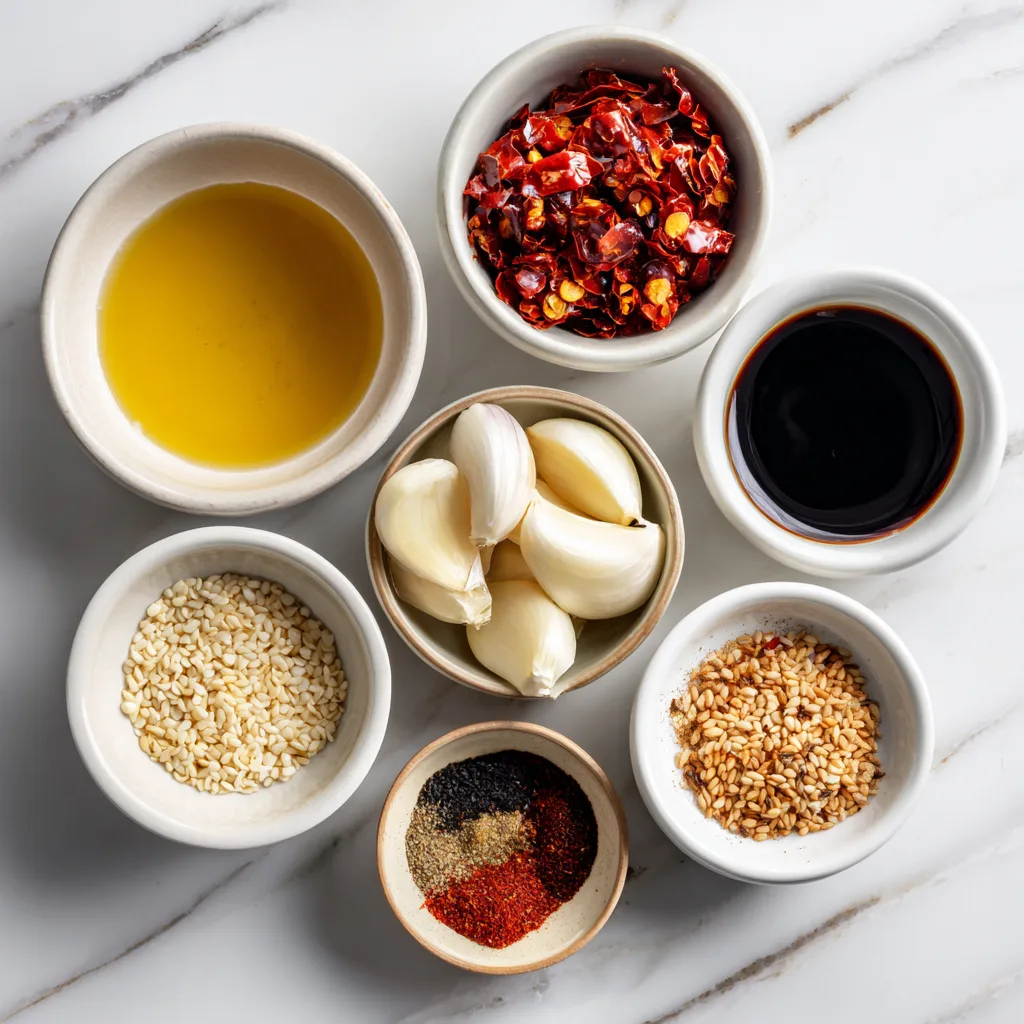 Garlic chili oil is a flavorful infused oil made by pouring hot oil over a mixture of chili flakes, garlic, and spices. The heat of the oil blooms the spices and releases their aromas, creating a rich, complex condiment with layers of heat, umami, and nuttiness.