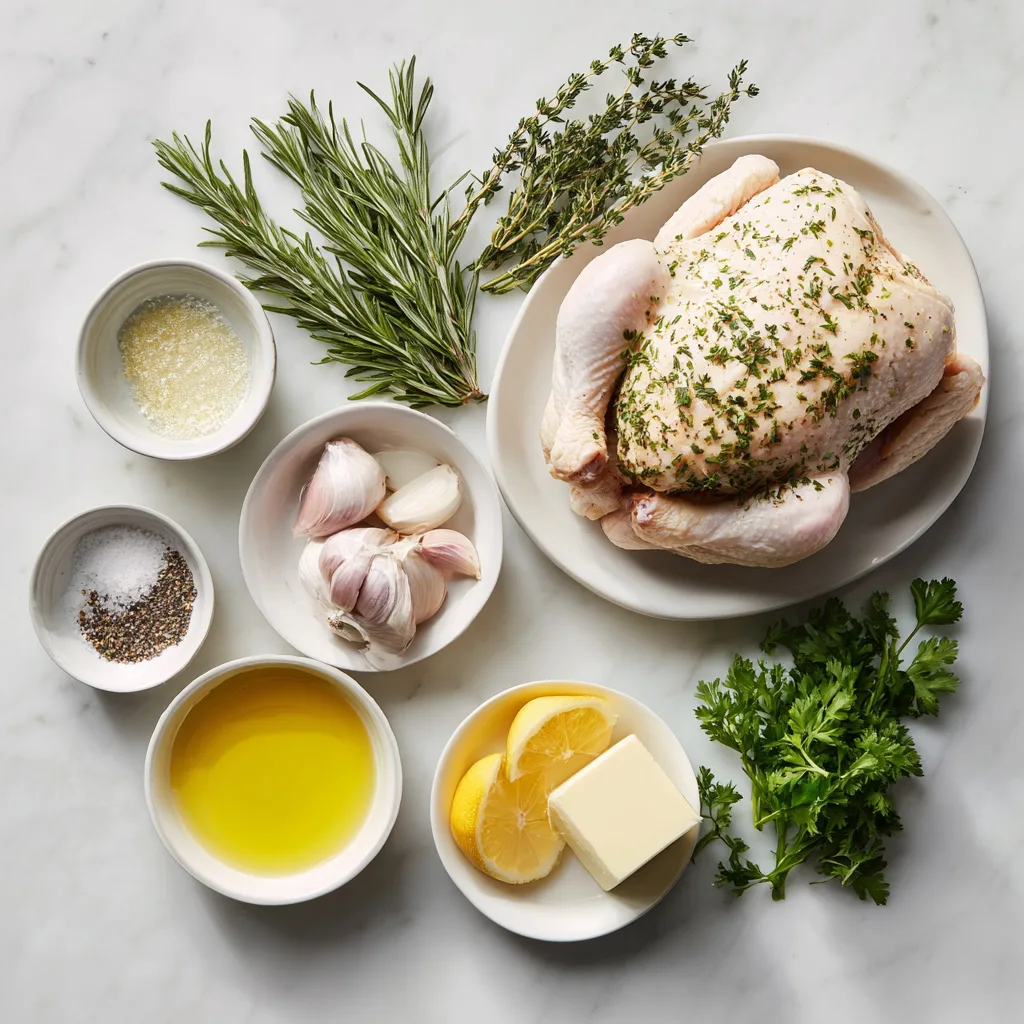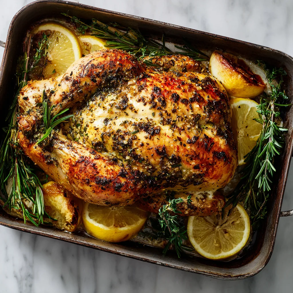 A classic oven-roasted whole chicken coated with garlic, butter, and fresh herbs for crispy skin and juicy meat.