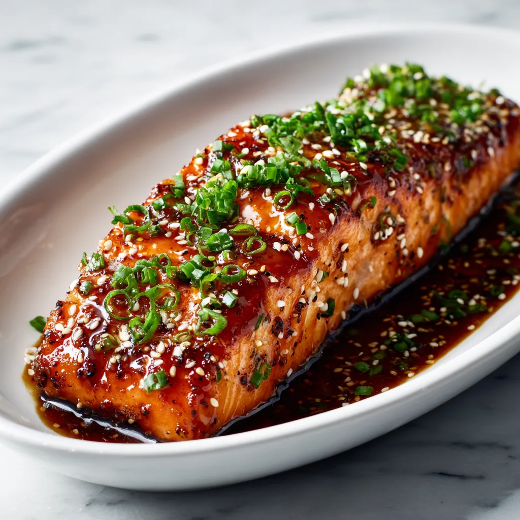 Once the salmon is fully cooked and coated in a glossy glaze, remove from heat. Sprinkle sesame seeds and chopped green onions on top. - Serve immediately