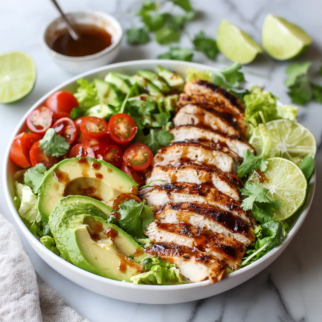 A fresh and vibrant salad featuring juicy grilled chicken, crisp vegetables, and a sweet tangy honey lime dressing.