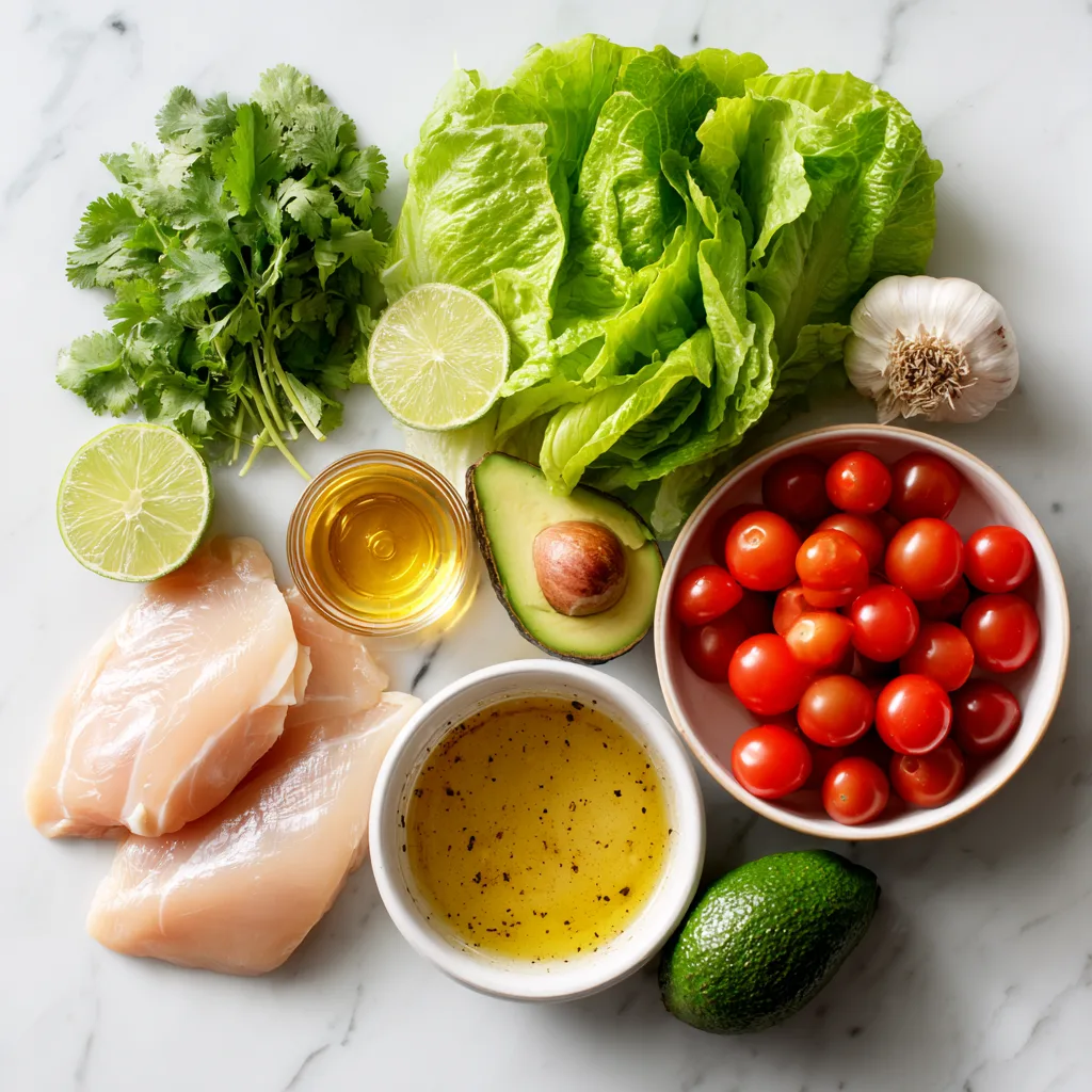 In a large bowl, combine chopped lettuce, cherry tomatoes, avocado, red onion, and cilantro.