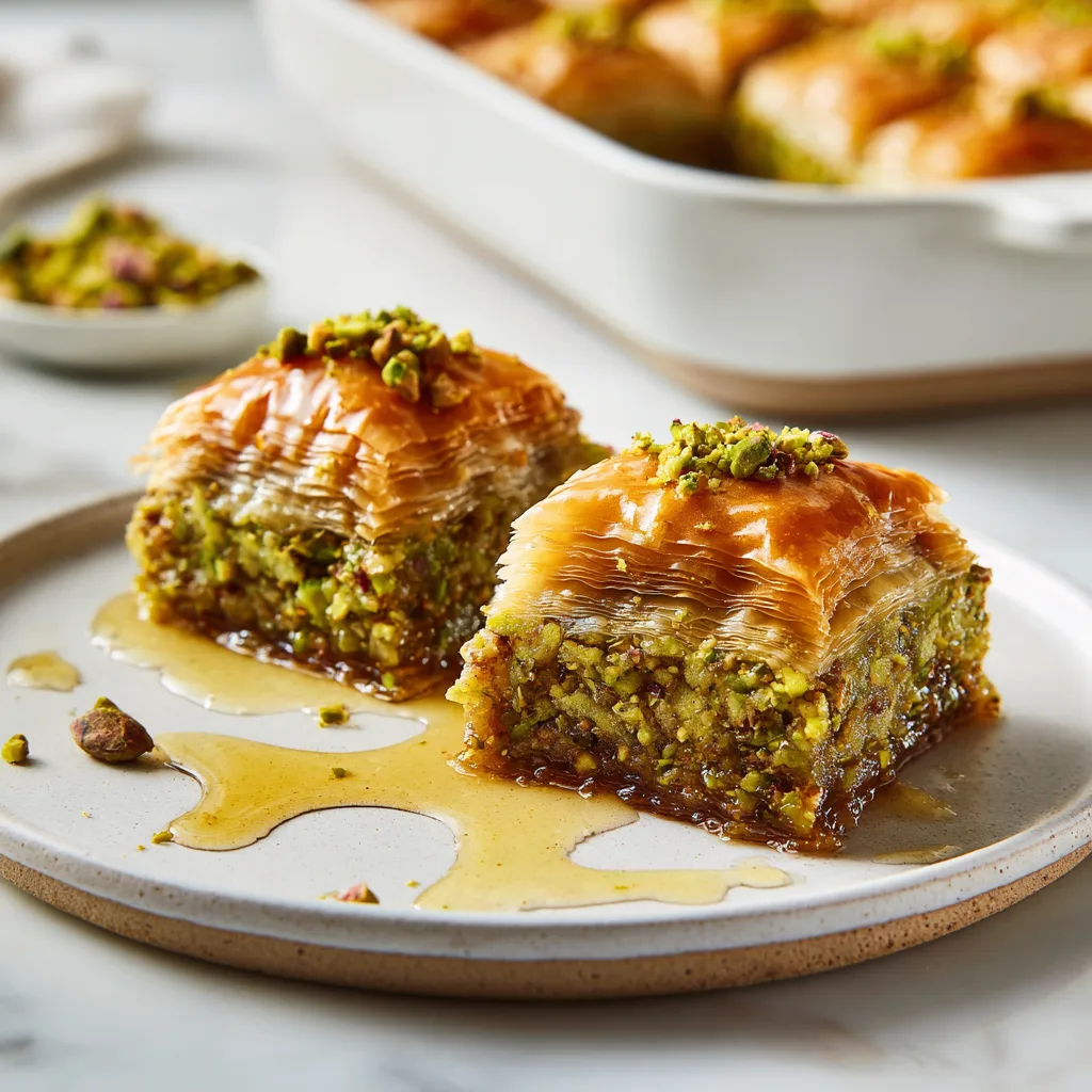 Golden flaky layers topped with vibrant pistachios create a dessert that looks as luxurious as it tastes.