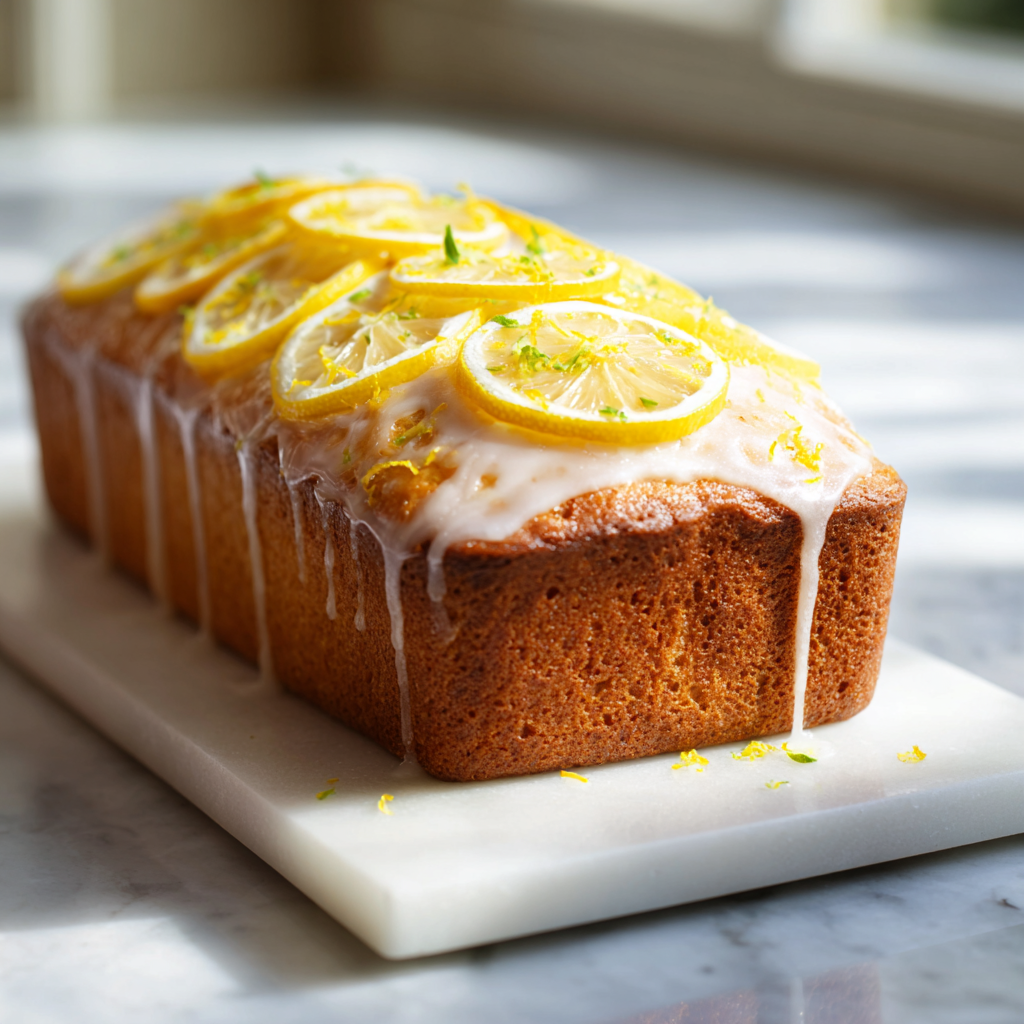 A moist and zesty lemon loaf cake topped with a sweet citrus glaze, perfect for dessert or a refreshing snack.