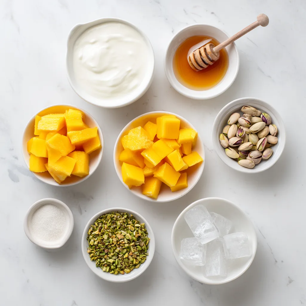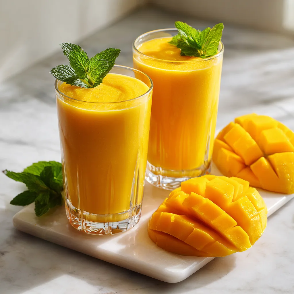 A creamy, refreshing Indian yogurt drink blended with ripe mangoes, milk, and a hint of cardamom.