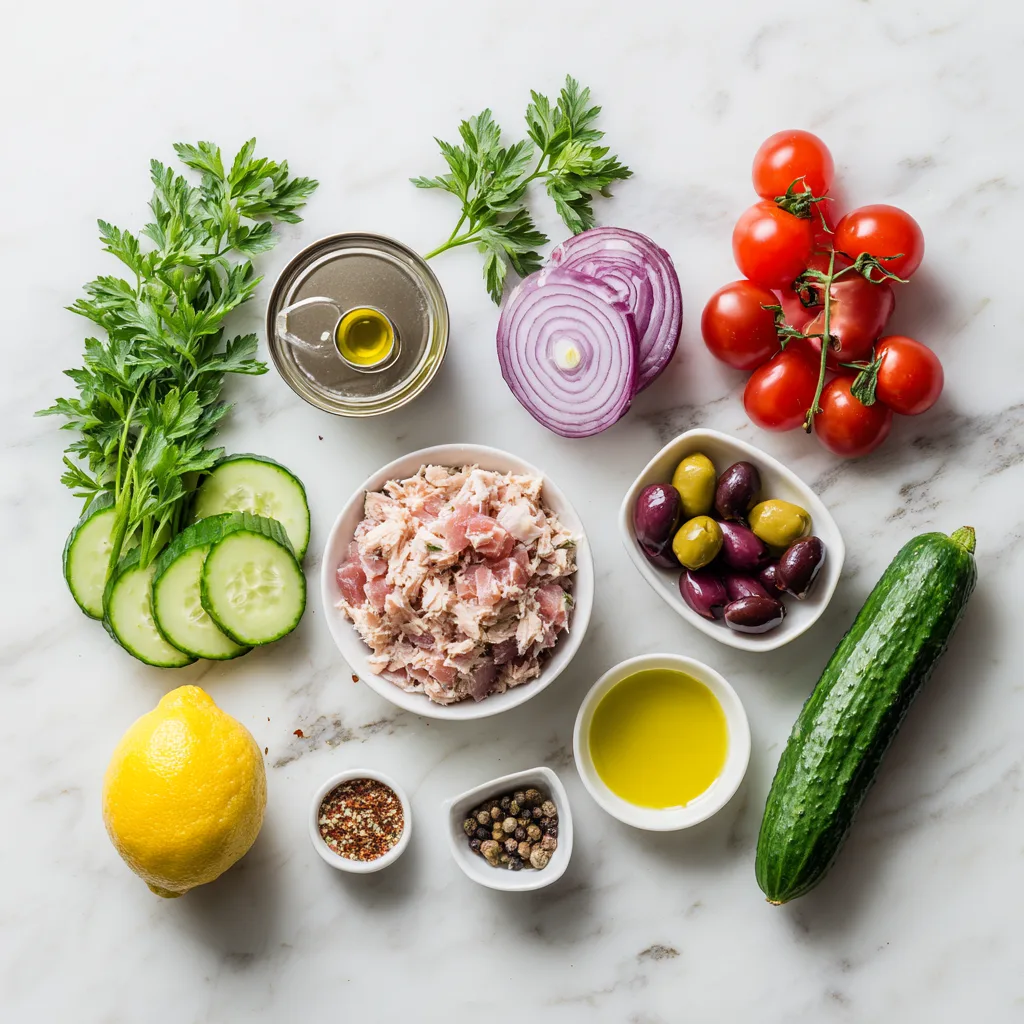 A light, refreshing tuna salad packed with Mediterranean flavors, fresh vegetables, and healthy olive oil dressing.