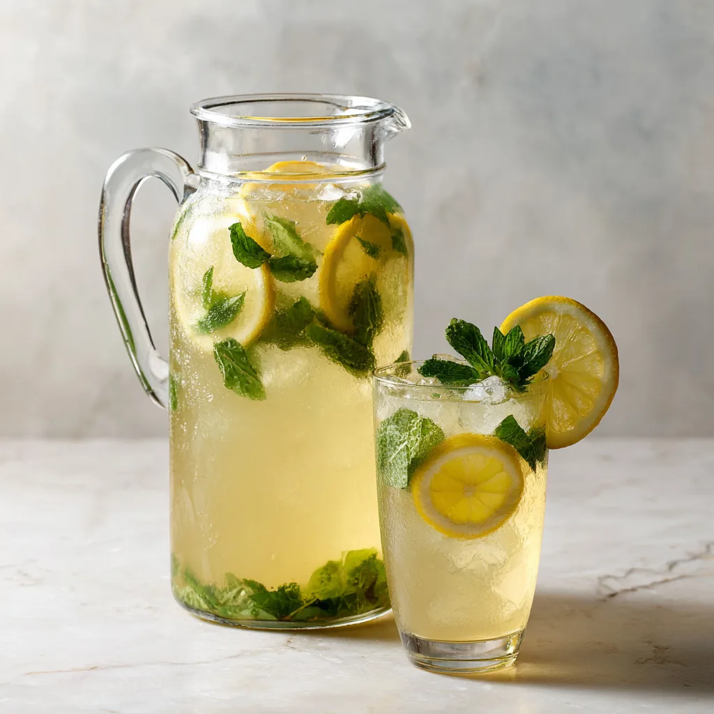 - Serve in glasses over ice and garnish with lemon slices and fresh mint sprigs.