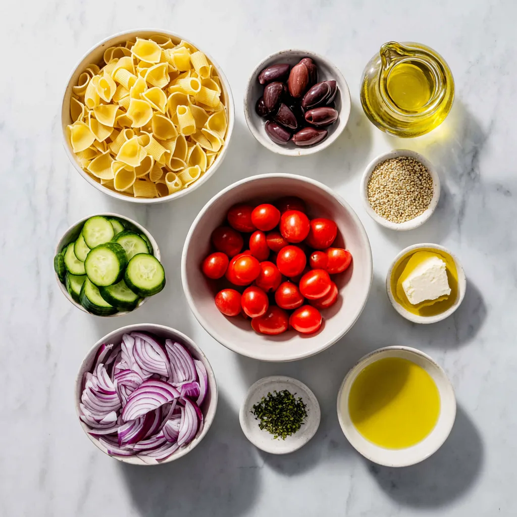 While the pasta cools, chop the cherry tomatoes, cucumber, red onion, bell peppers, and parsley. Slice the olives and cube the cheese if needed. - Make the Dressing