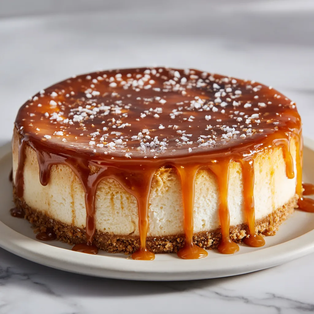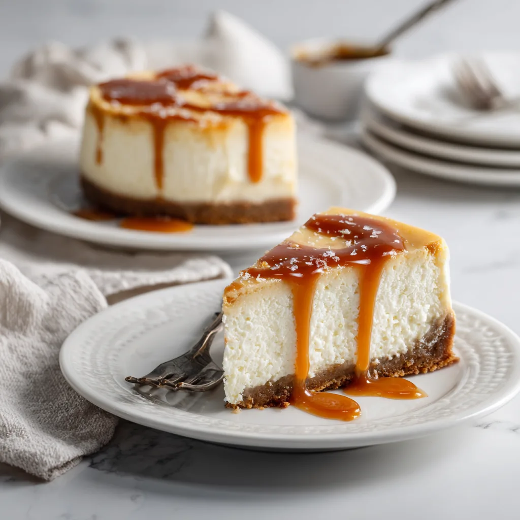 - Bake cheesecake in a water bath for 60–70 minutes, cool gradually, chill, then top with salted caramel.