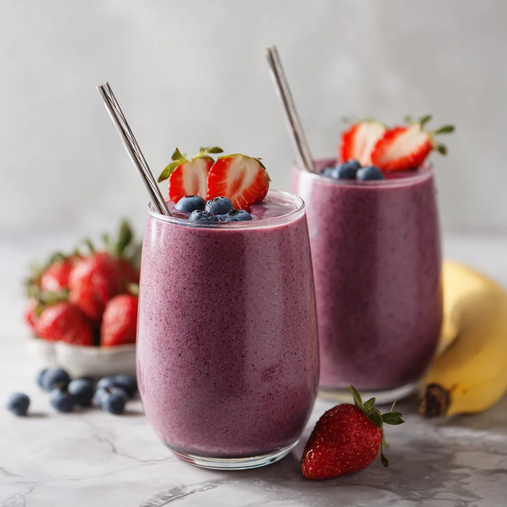 The combination of banana and berries creates a naturally sweet and tangy flavor, while yogurt and milk ensure a creamy consistency. Whether you’re starting your day or recharging after a workout, this smoothie delivers both energy and satisfaction.