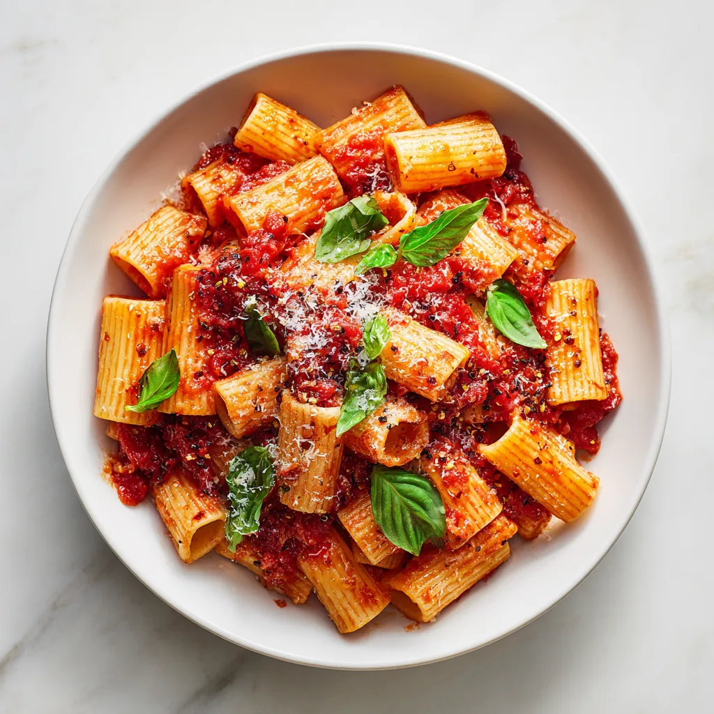 This bold pasta recipe combines tender rigatoni noodles with a deeply flavorful tomato sauce infused with garlic, olive oil, chili flakes, and fresh basil. The result is a dish that feels rustic and authentic, yet vibrant and modern enough to serve at any dinner gathering.