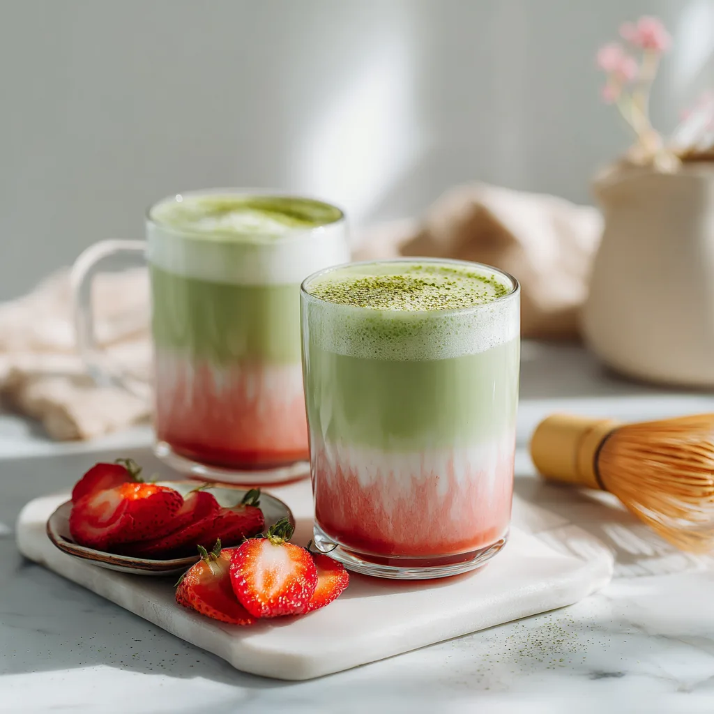 A refreshing layered drink combining sweet strawberry puree, creamy milk, and earthy matcha.